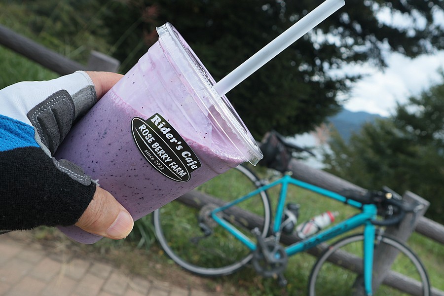 もう、夏のブルーベリー収穫も終わったってことで、Rider’s Cafe のキッチンカー出てたんで、スムーシーいただくよ。