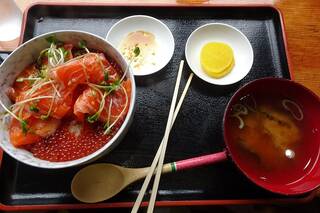 朝お会いした時に、今日のランチは、名物の「ダム放流カレー」と、この時期限定「ます親子丼」とどちらが? とお訊きしたら、ます親子丼のある釣り場を考えてた、ってこって、いざ、リヴァスポット早戸川へ。
