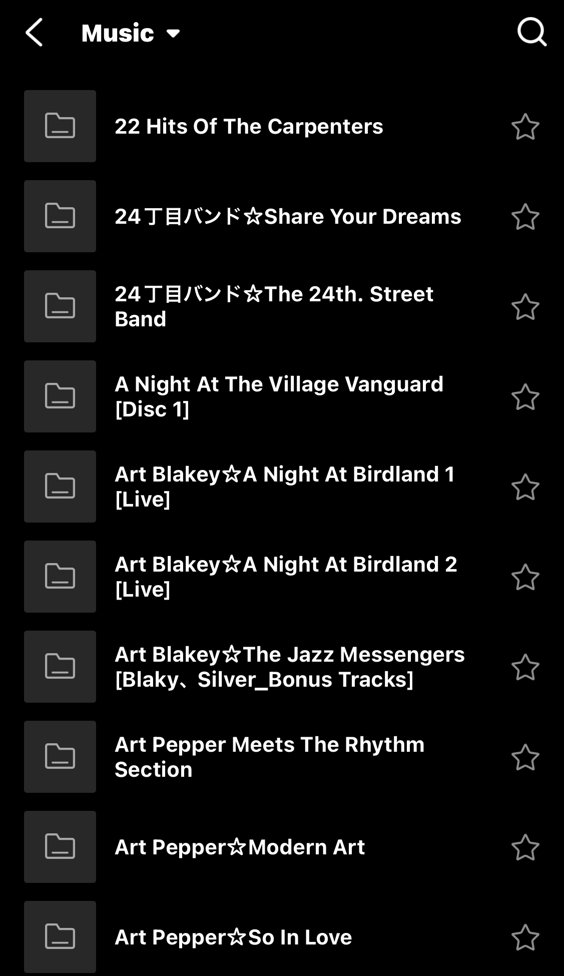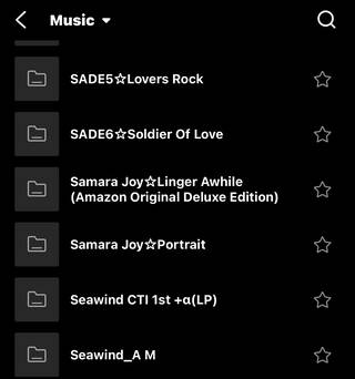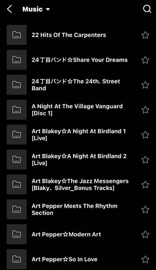 スマホのアプリ「Wiim Home」でアルバム名を表示させると、フォルダの構成や階層に関係なく、曲の入ってるフォルダ名がこの様に並ぶ。