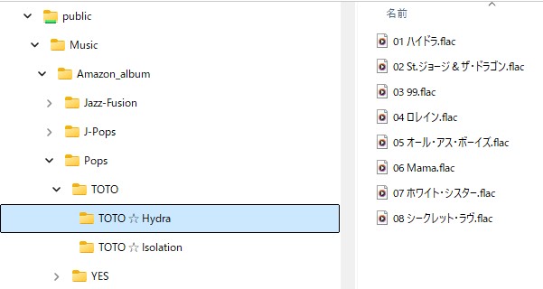 Nas-hdd\public\Music\Amazon_album \Pops と選んでやると、その下に勝手にアーティスト名(ここではTOTO)フォルダを勝手に作って、その下にアルバム名(Hydra)のフォルダを作って、その中にflacファイルでDLされる。