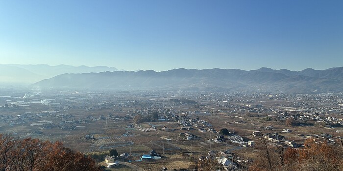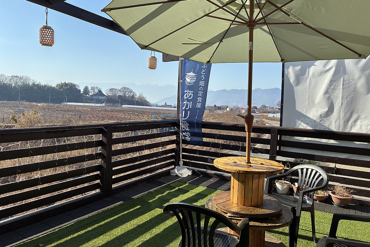 正面の「ぶどうの丘」の景色。左端に「天空の湯」が見える。
