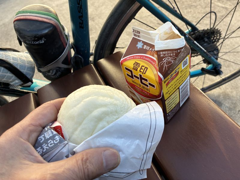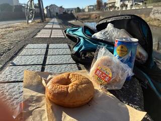 トイレに寄ったコンビニで「今だけ焼きたてパン30円引き!のポップに釣られたリングドーナツと、家から持ってきたおにぎりで、軽補給。