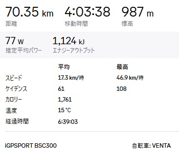 上:長アンダーm、アームウォーマー(帰路、美山通り入口迄)、夏ジャージp、ウィンドブレーカー(ちとせ屋迄、時坂峠DH~美山通り入口)