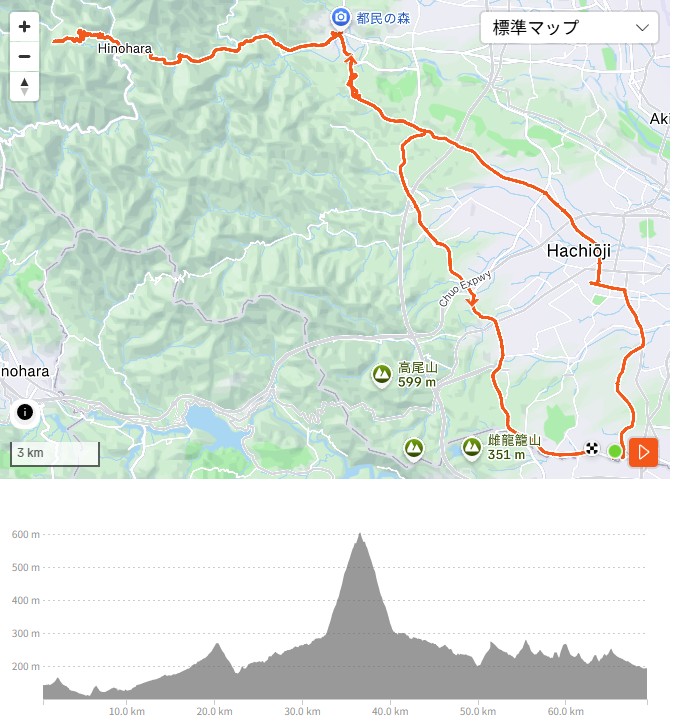 行きは、アップダウンの少ない、兵衛川沿い → 16号 → 秋川街道 → 武蔵五日市駅 ルート。