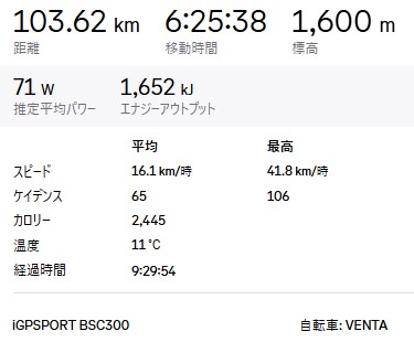 とはいえ、100km超、1,600m↑と、まぁまぁの自分的にはロングライドと言えるライドができ、ホッとしてます。